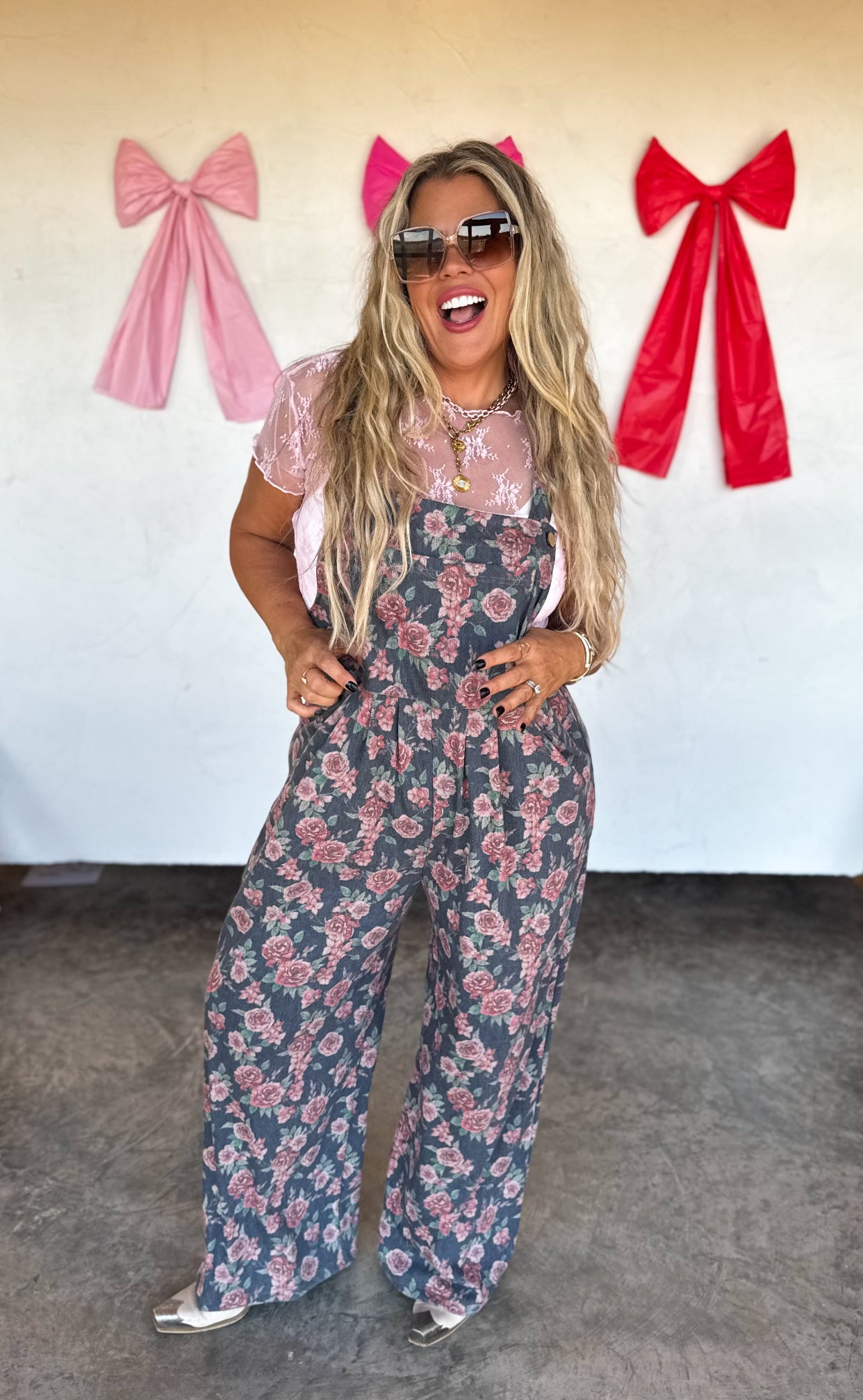 New floral print overalls! Printed on our super popular STRETCH denim fabric!