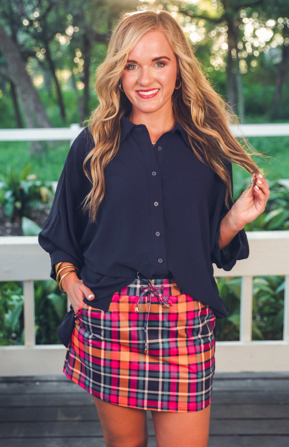 Check out our Patterned in Plaid Skort! This colorful piece features a vibrant navy, orange, and pink plaid design, along with a comfy elastic waistband and functional drawstring. Plus, it's equipped with side pockets and built-in shorts for added convenience. Made with stretchy material, it's perfect for all your adventures!