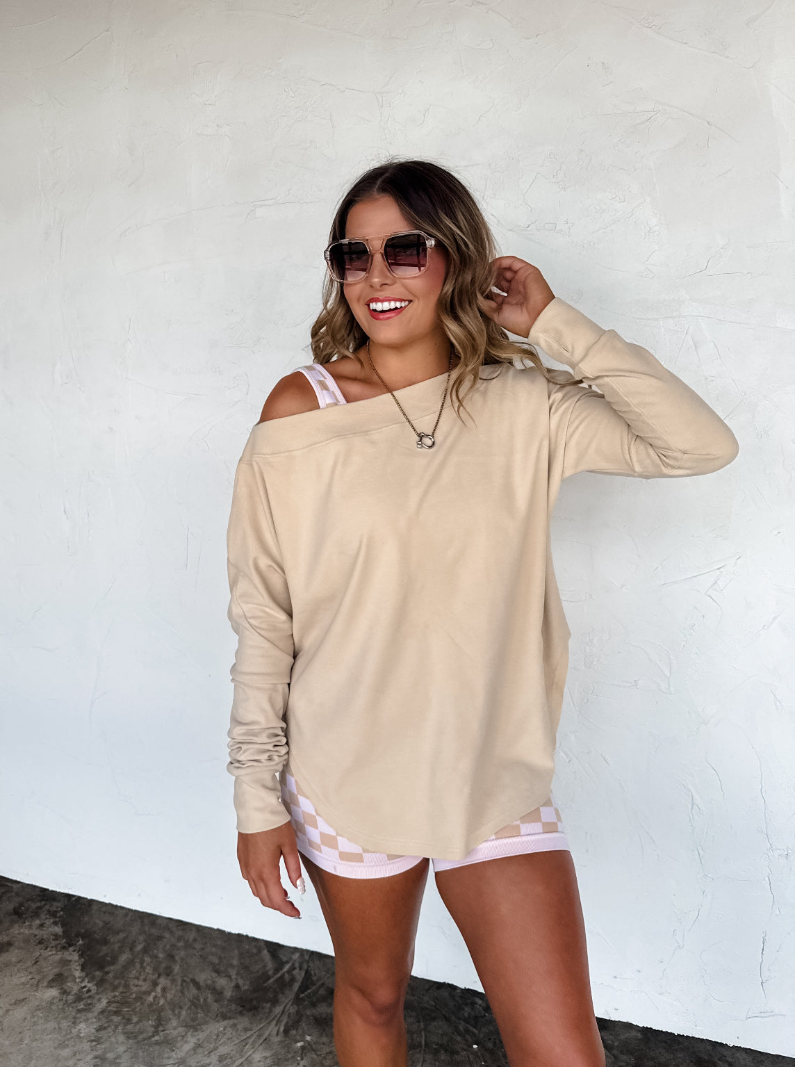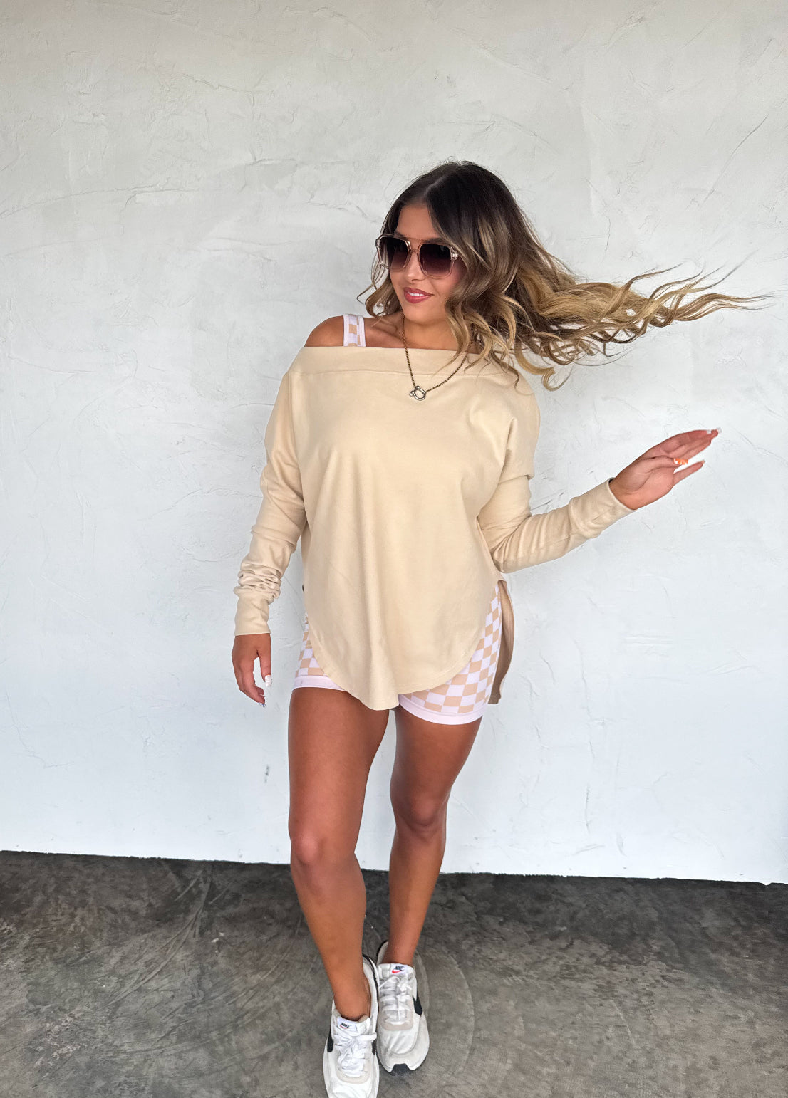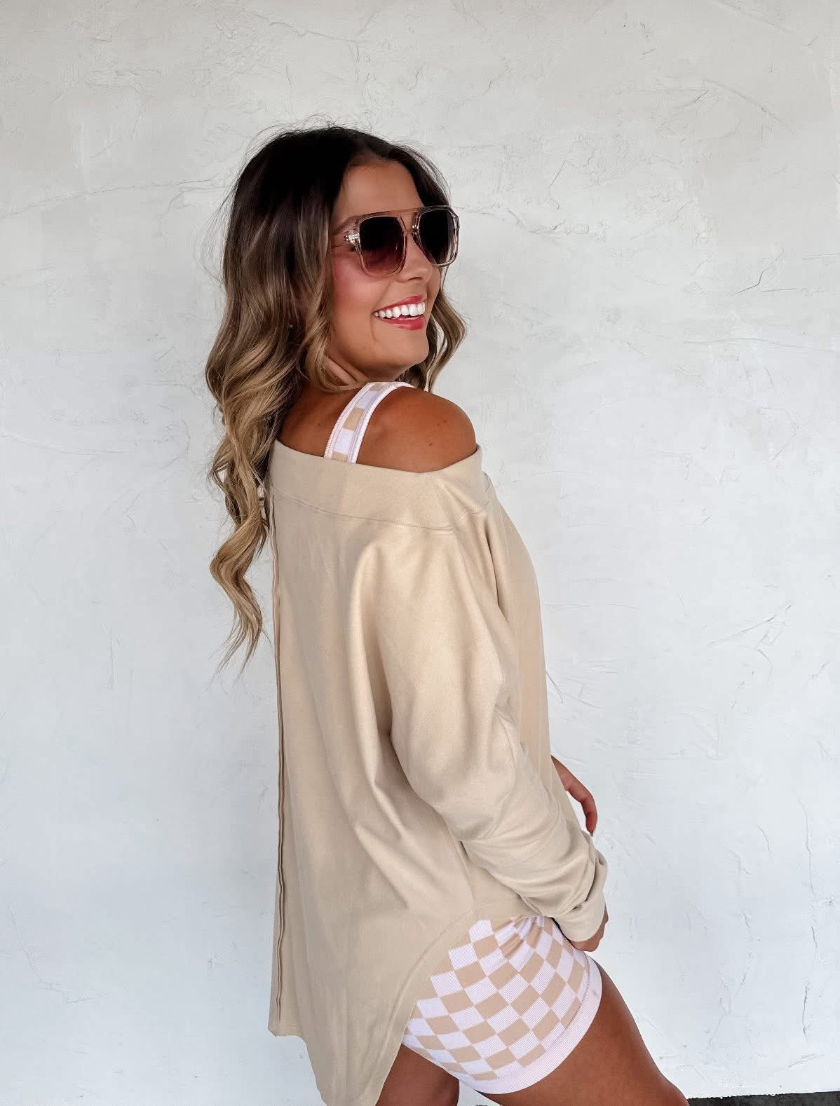 We spared no attention to detail in this SUPER soft sweatshirt! Light weight and so so stretchy. You wont find anything softer than this fabric! Features thumbholes, a boat neck to wear on or off the shoulder and the most flattering high/low hemline!